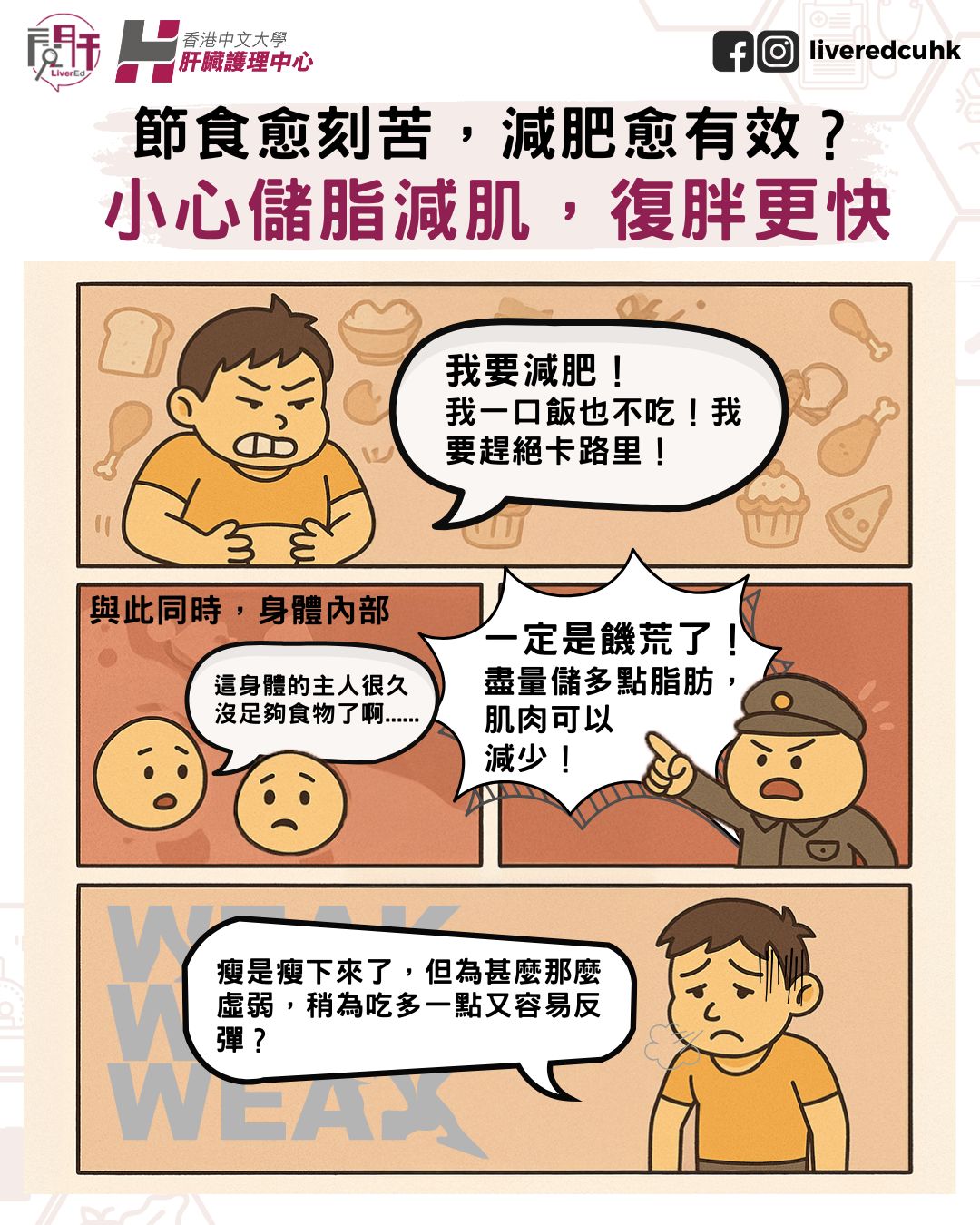 筆者在過往臨床經驗,以及與中大肝臟護理中心合作的研究計劃中,接觸過無數肥胖或患有脂肪肝的個案。發現不少人在應診前都曾採取「極低熱量飲食」,誤以為吃得越少減得越快。常見做法包括: